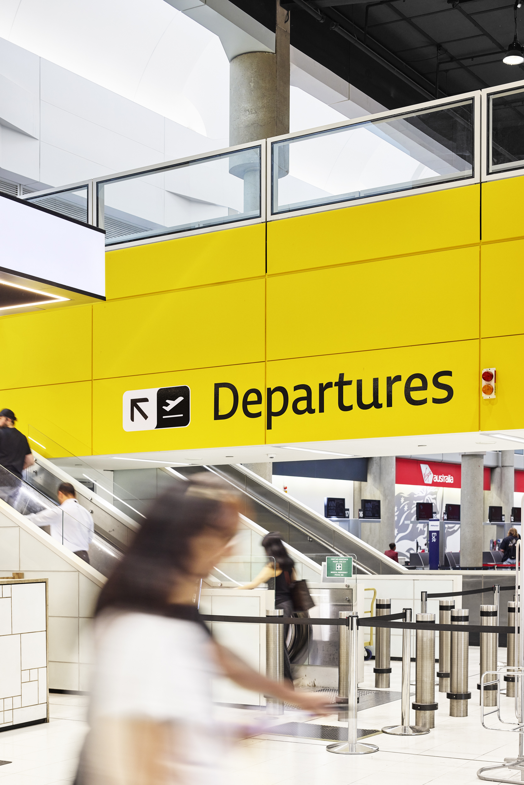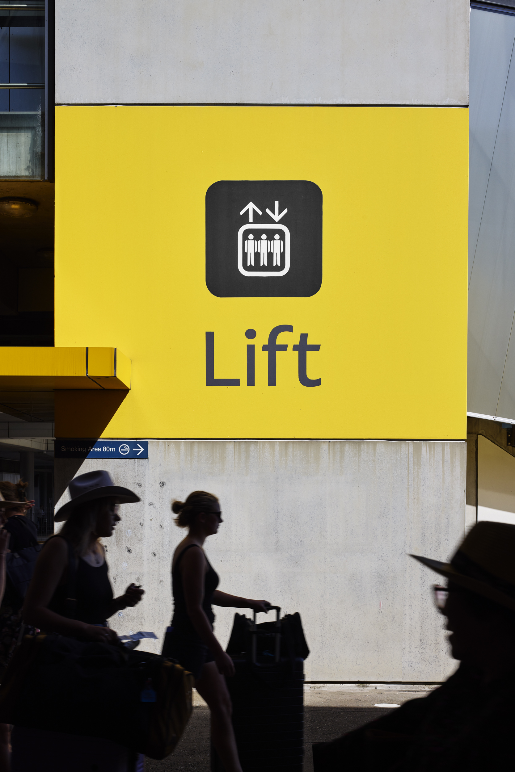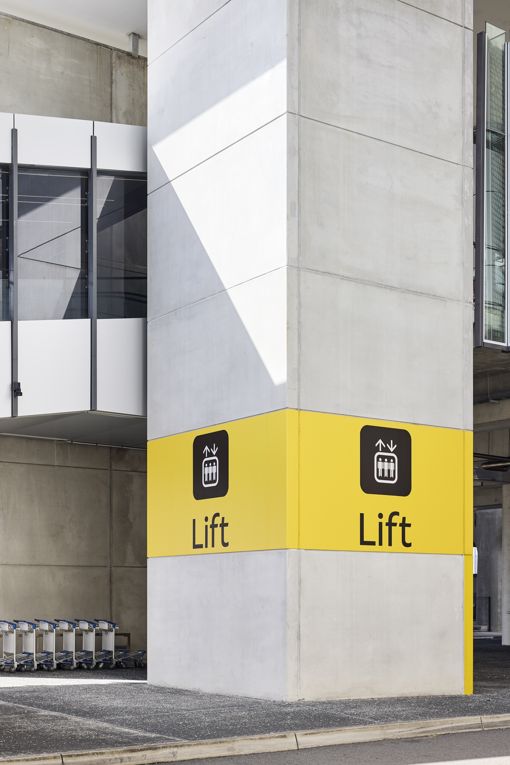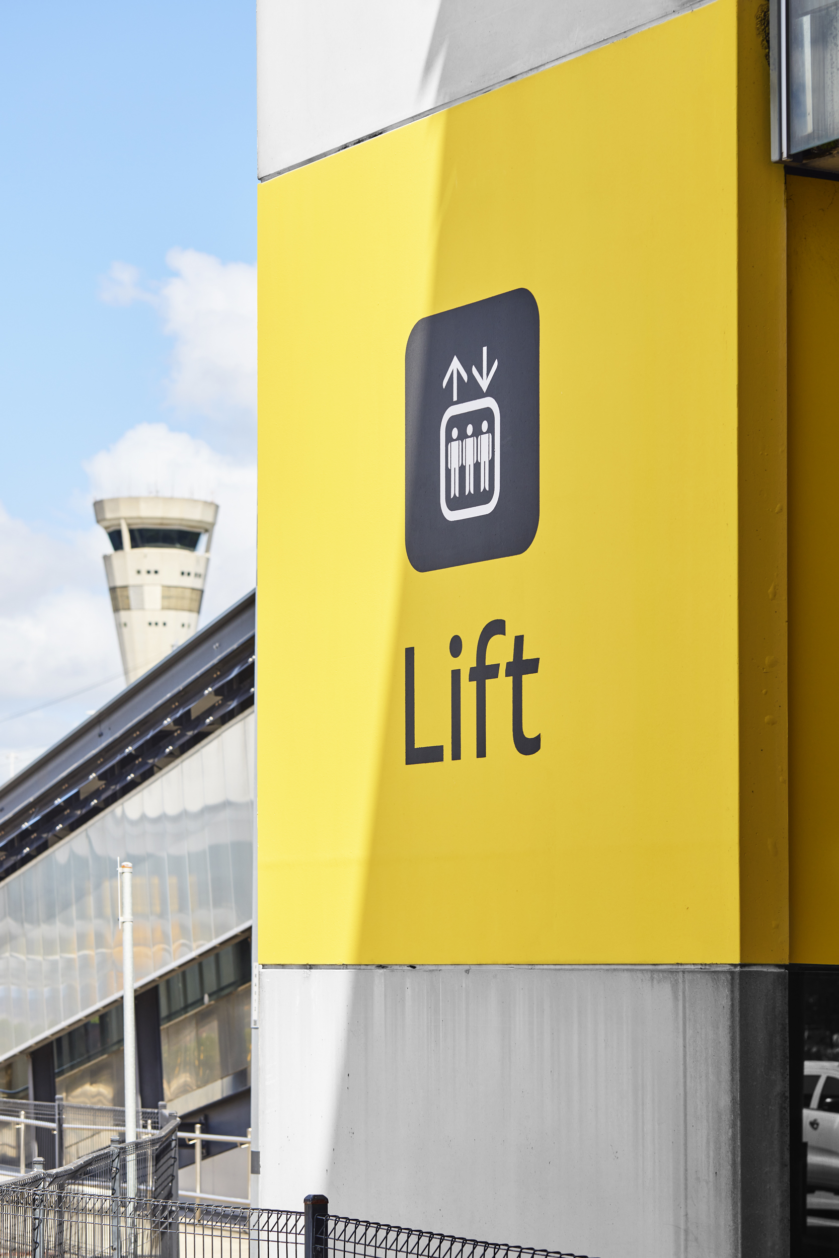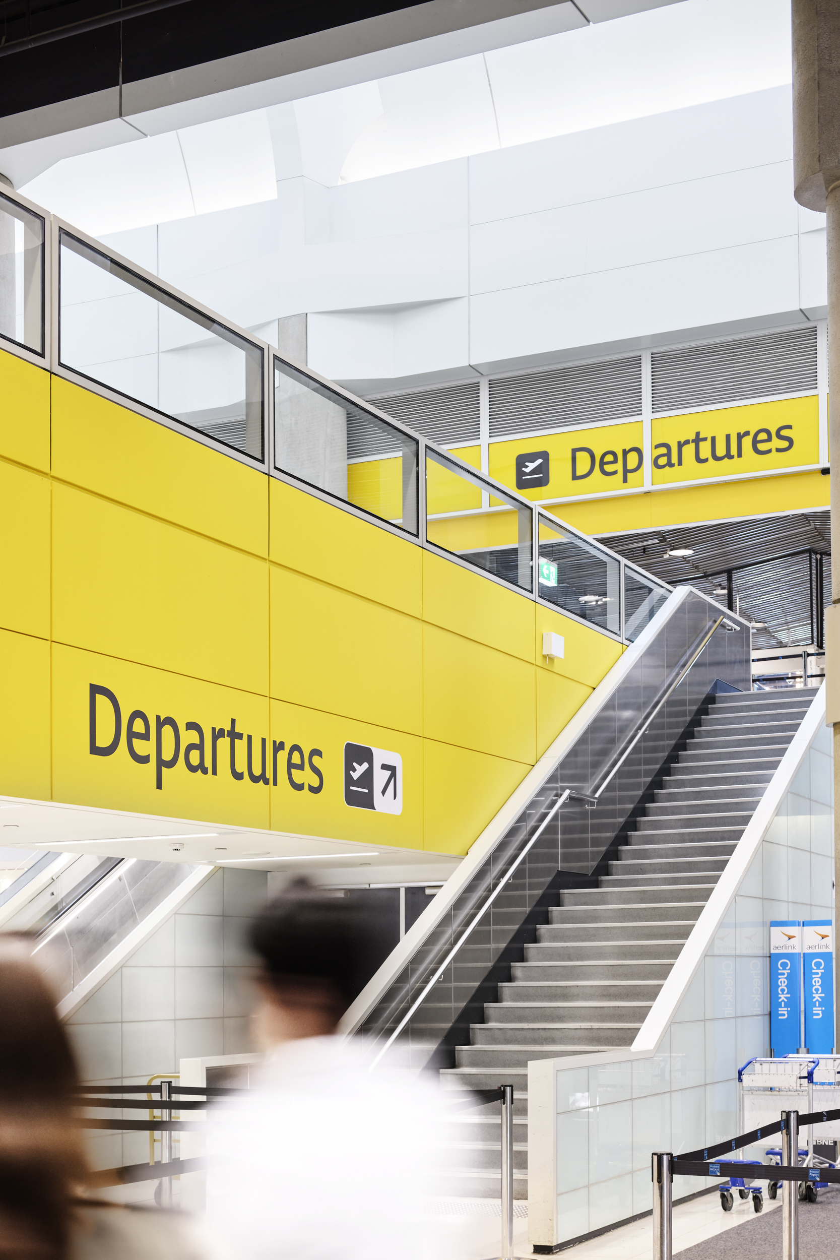 The design utilises yellow beacons that serve as prominent landmarks throughout the airport, ensuring that key information is easily visible and accessible. These beacons are supported by a strong graphic system that defines the layout and messaging of all directional signs, further enhancing visibility and comprehension.