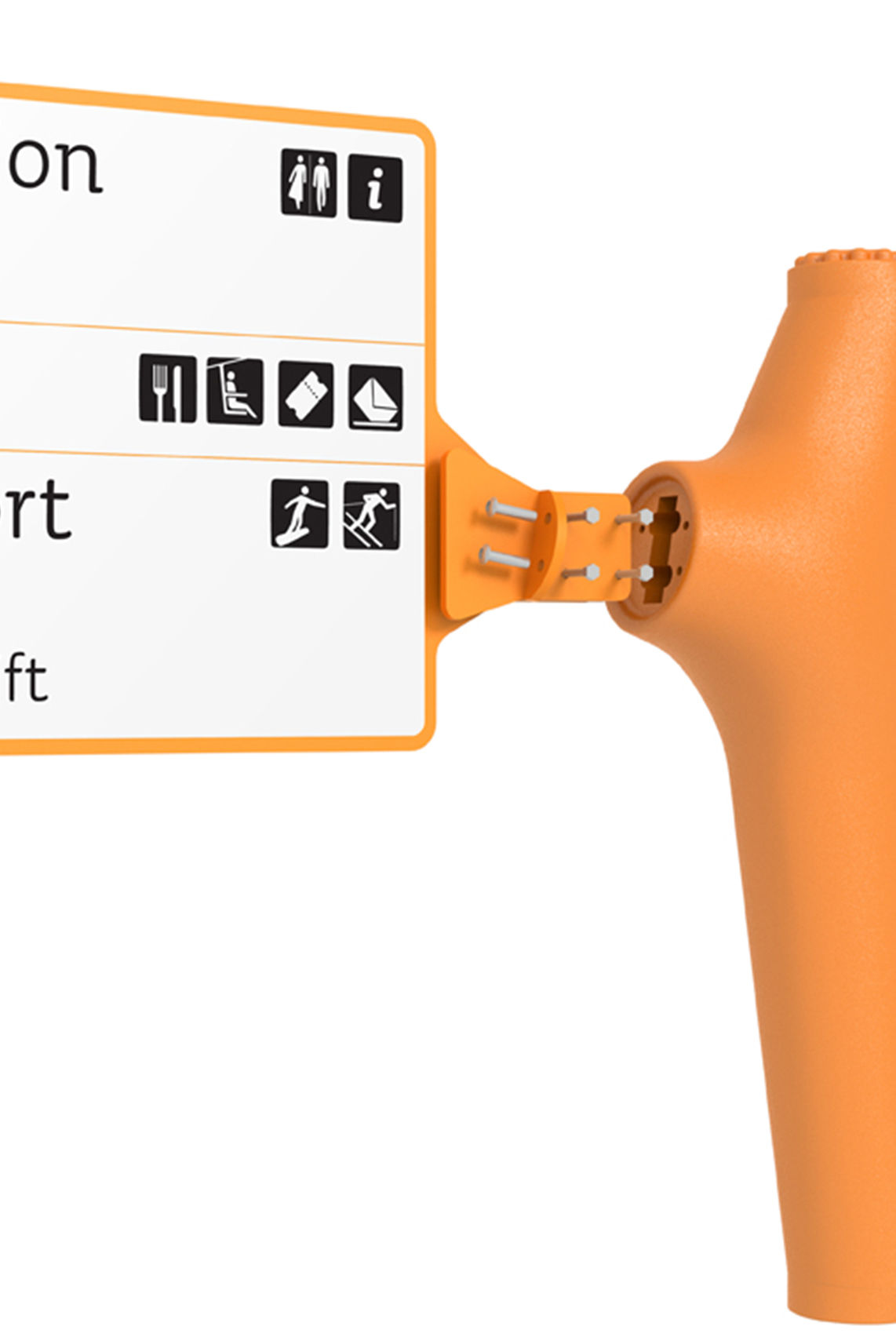 Büro North developed a modular sign system that provided clear information in various directions to suit the resort’s complex village layout. This system prioritized maximum visibility of information while maintaining a minimal structural footprint.